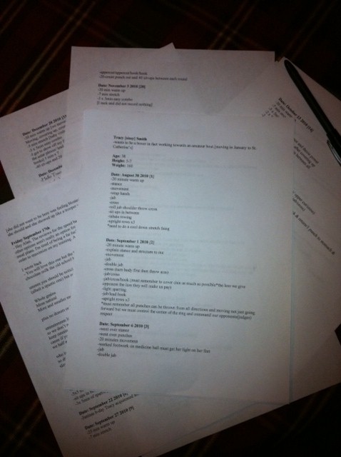 Now while I didn’t do any training or prep for my move, I did a lot of thinking. This morning, while sitting in my stylist’s chair, I finally had the chance to read the copy of my training log that Alan had been keeping and gave me as one of my Christmas presents. I was so impressed by the detail of the log and moved by Alan’s boxing/life observations. Reading it also caused a couple of uncontrollable cackle bursts; I’m pretty sure the other clients at Madison’s Spa weren’t that impressed when I shattered the tranquil spa atmosphere.