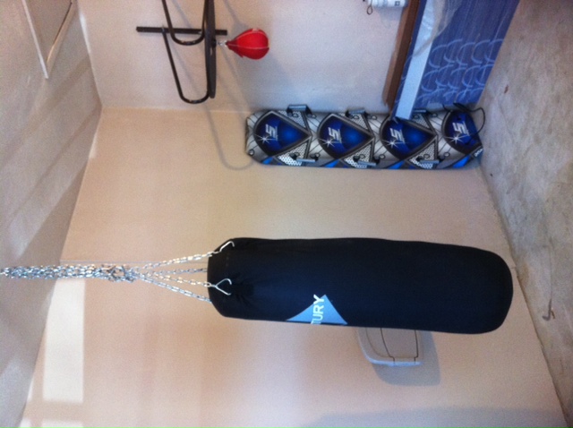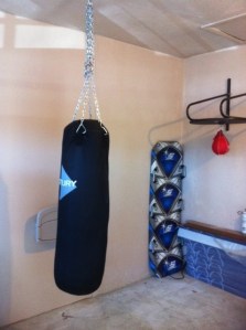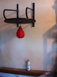 Today I ended up working out at The Hen House (aka Gail and Chris’ home). As luck would have it, their garage is set up with a heavy bag and a speed bag. There’s also tons of room to skip and shadow box.